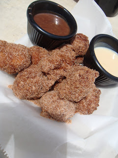 After ordering entrees from the brunch menu, we ordered a dozen Italian donuts. The menu described them as nutmeg and cinnamon donuts sprinkled with powdered sugar, accompanied with a Kahlua fudge sauce and a white chocolate sauce.