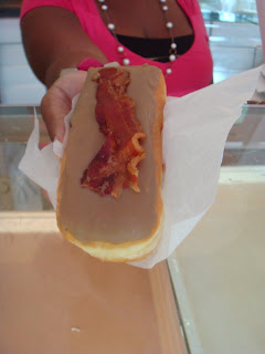 The girl behind the counter at Nord’s was very outgoing and made a couple of suggestions to us. We made our selections and paid, all the while chatting with her about the history of the bakery and the neighborhood. The bakery has been there for over 70 years and changed owners in the last few years but has kept the original recipes. When she asked what brought us in, I told her I blog about donuts and was from out of town. That brought about a whole new list of recommendations and we left with twice as many donuts as we initially purchased, including the maple bacon bar which we didn’t even notice. How could we miss a bacon topped donut?!? (If you are keeping count, that’s two donut shops with bacon this year, still hoping to visit Voodoo for the original.) We also snagged the reported favorite of President Bill Clinton, a beautiful cream frosted number.