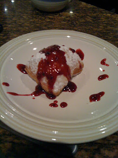 The beignets immediately brought to mind visits to Cafe du Monde in New Orleans. The smell was similar and the dough had the same texture. No gluten for me, so I skipped the beignet but not the raspberry melba sauce. That sauce was delicious and I drizzled my fresh fruit with it. I think it would be good drizzled on about anything, maybe even cardboard. It was really tasty.