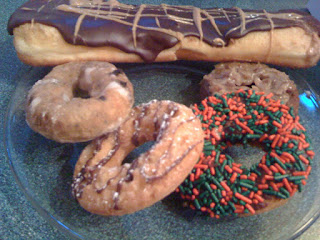 I brought the donuts home and John took a bite of the blueberry cake one first. He immediately asked if I had bought day-olds. Umm…not on purpose. He didn’t think they tasted fresh. He ate part of the enormous apple fritter and nibbled on the donuts but didn’t seem too enthused about any of them. As of this morning, the apple fritter box is still sitting on top of the frig, un-eaten donuts and a large part of the fritter growing even more stale. I can’t recall donuts ever sitting around this house for that long. But I’ll make a few more excuses for the Donut Place. Maybe it’s because of all of the other Christmas goodies around here. Maybe it’s donut burn-out. Maybe they just weren’t that great.