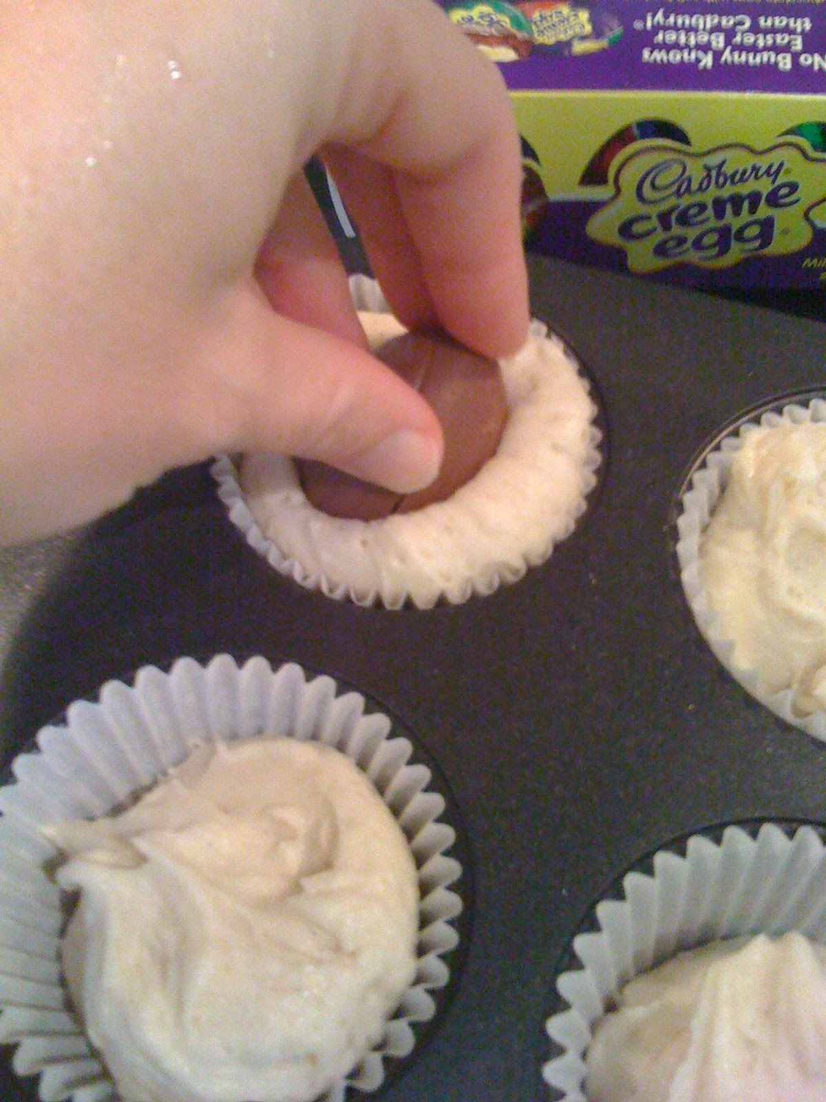 About those Cadbury eggs: I thought they were disgustingly sweet. I know, I know, I write about SWEET treats every week. But these were just too much. Or so I thought until I stuck them in cake batter and baked them. Suddenly they became exquisite. All I can compare this flavor upgrade to is a deep fried Twinkie. Never a fan of Twinkies, I had one deep fried and found it to be insanely yummy. The cream filling was somehow like a French pastry cream and the indestructible cake part of the Twinkie….well, it was just a pleasant surprise. Same with the Cadbury eggs. The filling crystallized in some of the cupcakes, but remained a little runny in others. In all of them, it was a tasty surprise, a little chocolate-y goodness tucked inside delicious white cake.