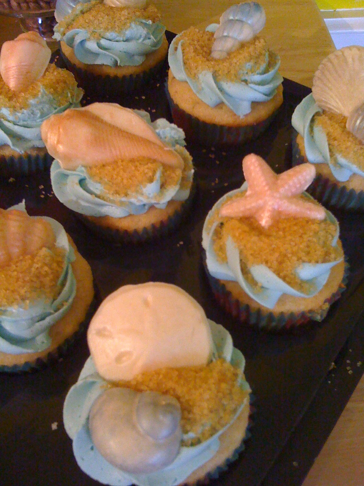 I frosted these with my standard buttercream frosting and topped them with a sprinkle of raw sugar and molded white chocolate seashells I made earlier in the week.  It was not intentional, but I realized the chocolate molds are a bit of a tradition for my birthday.  I bought them for a milestone birthday of mine 8 years ago, made the chocolates at home and hand-carried them on a plane to Florida to decorate my birthday cake, served beside the Gulf.  In the interim, they have been used for one friend’s birthday cake and shipped back and forth to Florida a time or two for use by a baking friend that relocated to the Mouse’s House from Missouri.