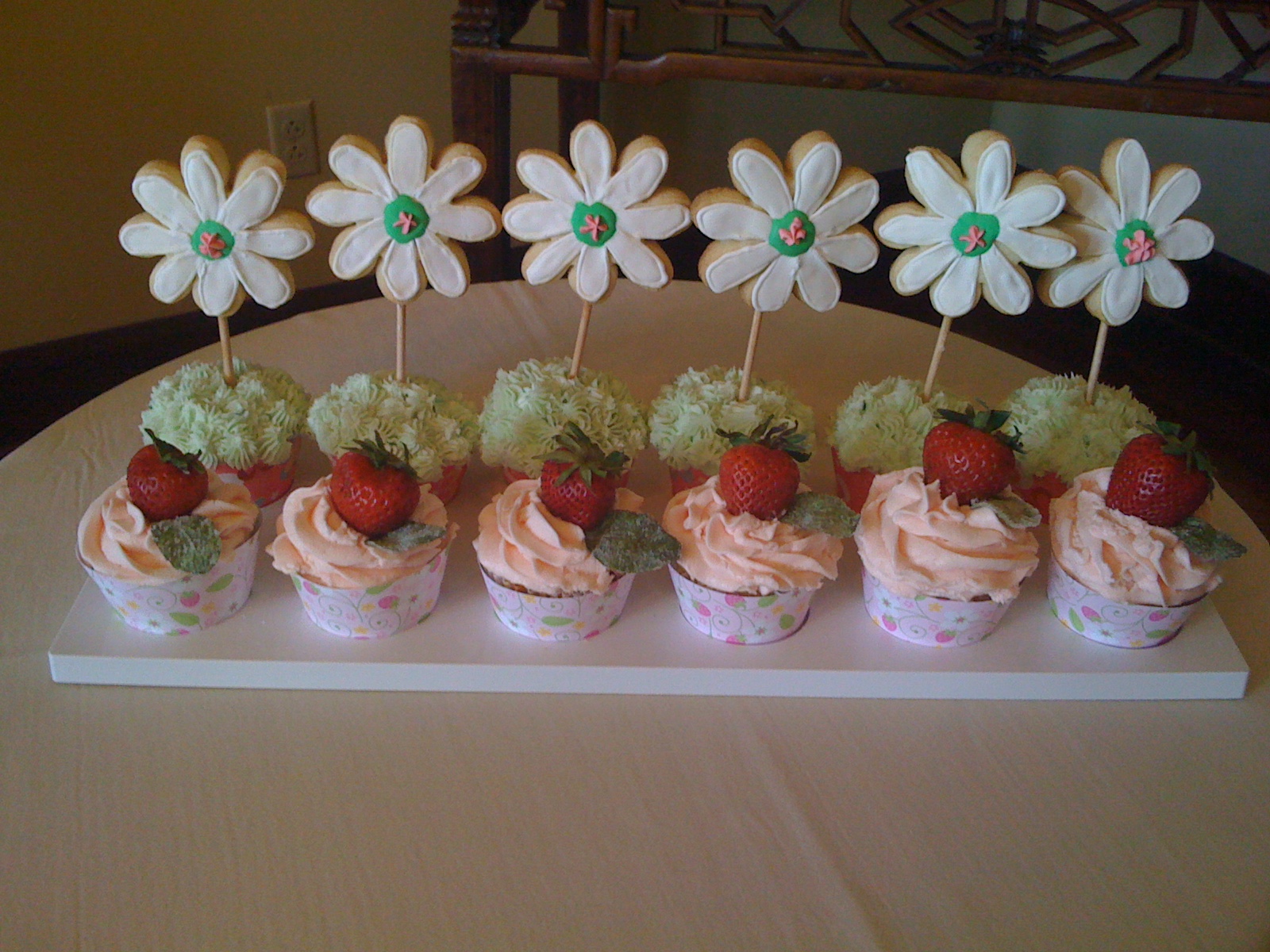 My entry included Strawberry Mint Cupcakes with strawberry frosting topped with a strawberry and a candied mint leaf and Mojito Cupcakes with mint frosting topped with Daisy Cookie Pops. I made cupcake wrappers using a template from Skip to My Lou and displayed them on a cupcake tray I bought at Sprinkles either in Dallas or Beverly Hills. I can’t remember which location I bought it at, just that I had trouble stuffing it into a suitcase to get it back to KC. I remember being convinced I needed that cupcake tray, yet this was the first time I had ever used it. See, I really did need it!