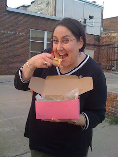 On Earth Day, Celeste, Em and I drove to Pittsburg, Kansas for the PostSecret event. The creator of the PostSecret project, Frank Warren, spoke and signed books. It was a terrific road trip, thunderstorm and all. Oh-and there was a little disenchantment. Many things have a dirty underbelly and it takes a long time for discover just what that is. It took less than an hour in the presence of Frank Warren to change how all three of us feel about the PostSecret project. I think we may each have a different take on what the dirty underbelly of PostSecret is but I’m supposed to be blogging about baking and the friend with whom I shared the treat…maybe another time I can rant about secrets.