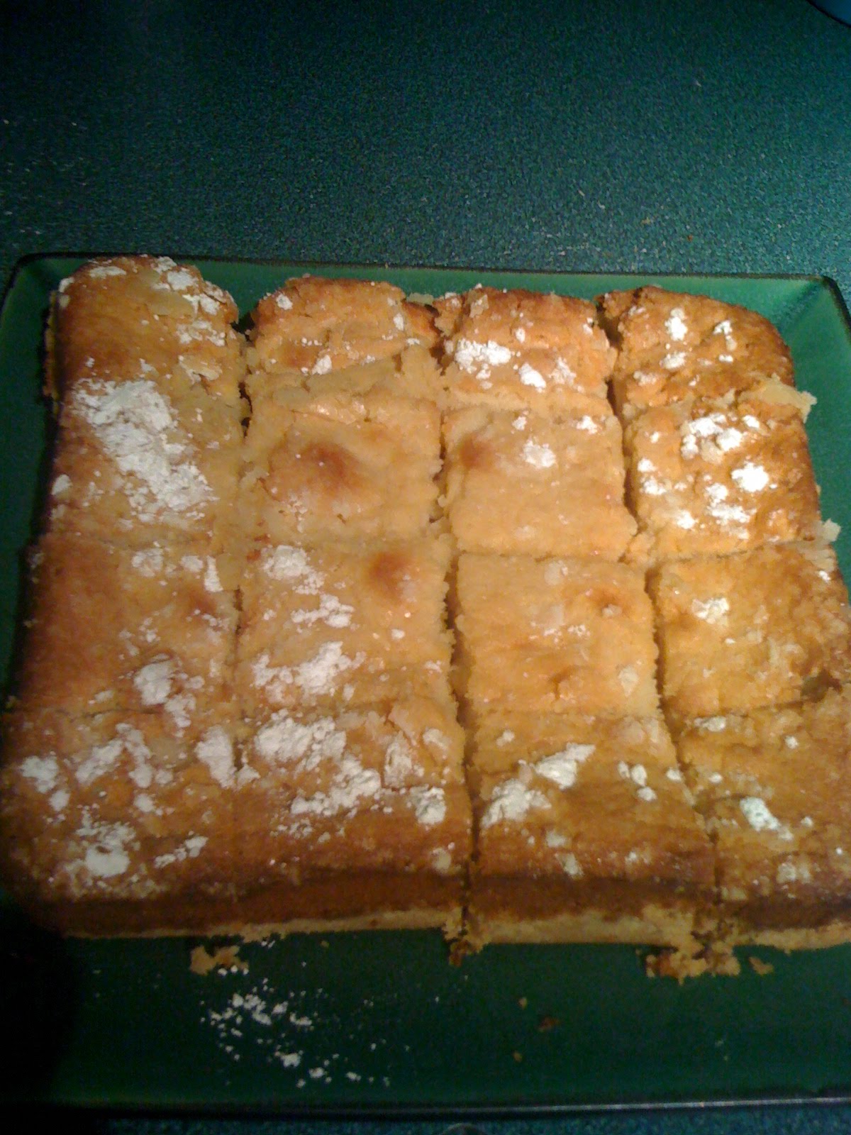 Pour filling on top of crust. Sprinkle with powdered sugar. Bake 30-35 minutes or until cake is nearly set. It will still be jiggly in the middle, but not runny. Let cool in pan. Slice into 12 squares.