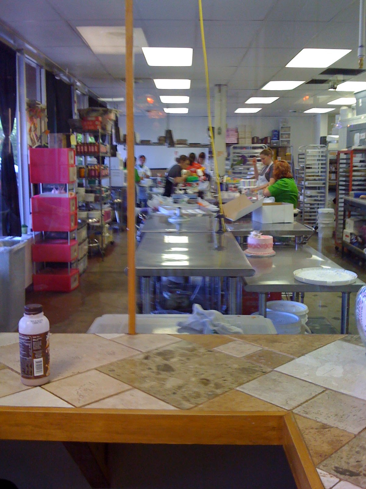 Rick’s Bakery is HUGE. It consumes most of a strip mall in Fayetteville. Two huge delivery vans were waiting to be loaded with deliveries and a steady flow of people were entering through the front door. To the right of the front entrance was the wedding cake area, where many cakes were on display in the windows and bakery cases. Straight ahead was the donut case, the only place where there was a line. A huge neon DONUTS sign was over the case. A fresh orange juice machine that works with whole oranges, similar to one I saw at a farmer’s market in St. Petersburg, Florida, was near the donut case. Strange combination, orange juice and donuts, but a delicious offering! To the left was a gift shop area filled with cute aprons, everything imaginable with a cupcake on it, cute gifts, partyware…everything you might need to go with a cake! Beyond the gift shop was a small counter with seating and huge windows into the cake decorating area.