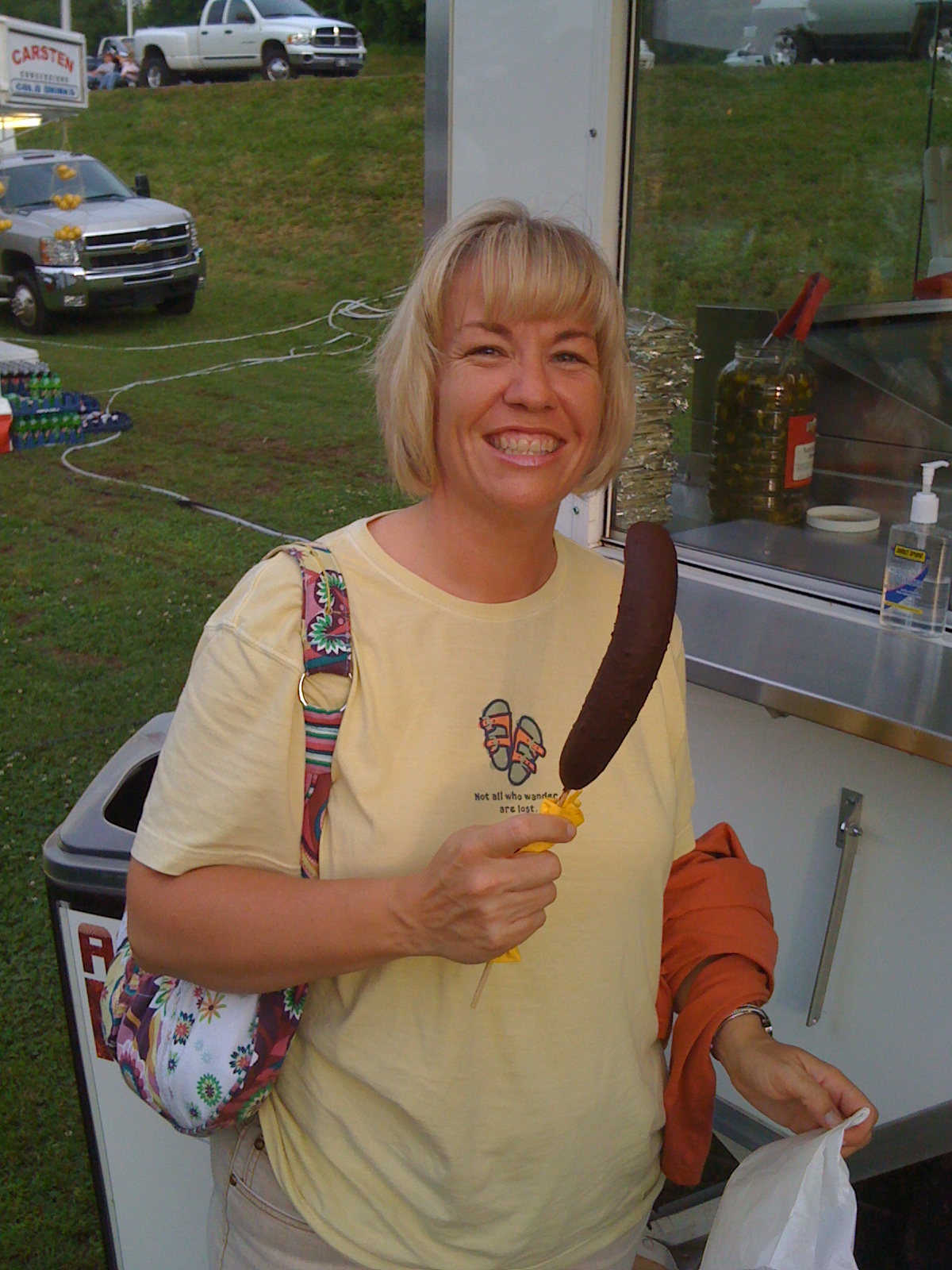 I bought this at Crawdad Days in Harrison, Arkansas.  It was $3 and worth every penny.  It was a large banana, perfectly coated in chocolate and frozen just right.  I am not a fan of bananas that are so frozen you can’t bite into them, but that wasn’t the case with this one.  I bought it from Kathy’s Kabana and enjoyed chatting with Kathy, who promised me she would consider offering chocolate covered dill pickles next season.