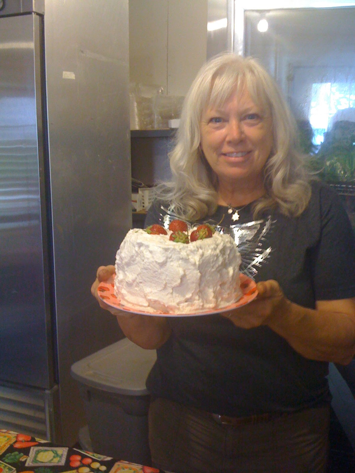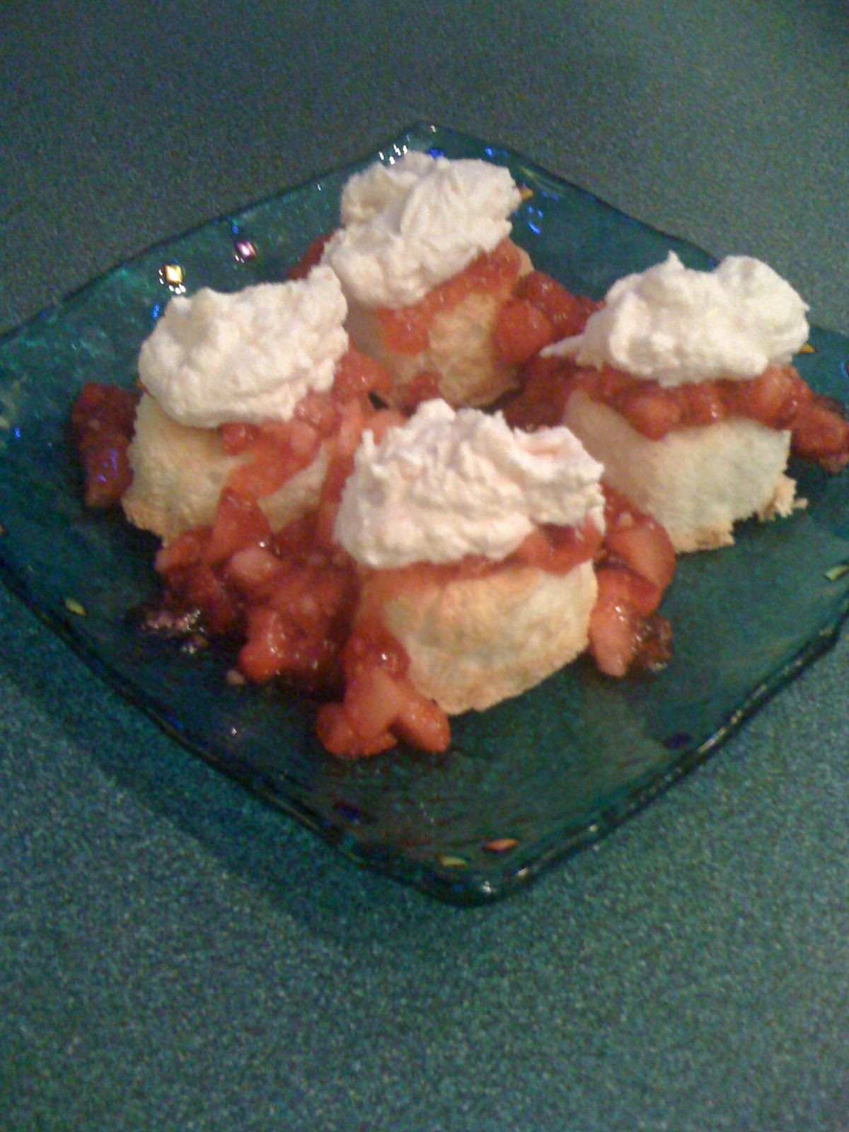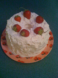 Growing up, this is the cake that was made for my birthday, which I share with my sister who is 13 years older than me to the day. I don’t recall either of us often having our own birthday cake, although I would guess my sister had her own cake until I came along just in time to accelerate her teenage angst. I do remember having a Barbie cake one year (not as beautiful as this one from Gourmet Baking), but usually it was this delightful Angel Food cake with the strawberry surprise in the middle!