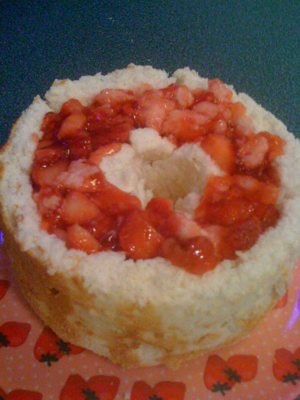 Add strawberries to the half of the liquid in the larger bowl and refrigerate until set. Once set, gently spoon in the pieces of cake you removed to create the tunnel. Spoon this filling into the tunnel of the cake and replace the top layer of cake.