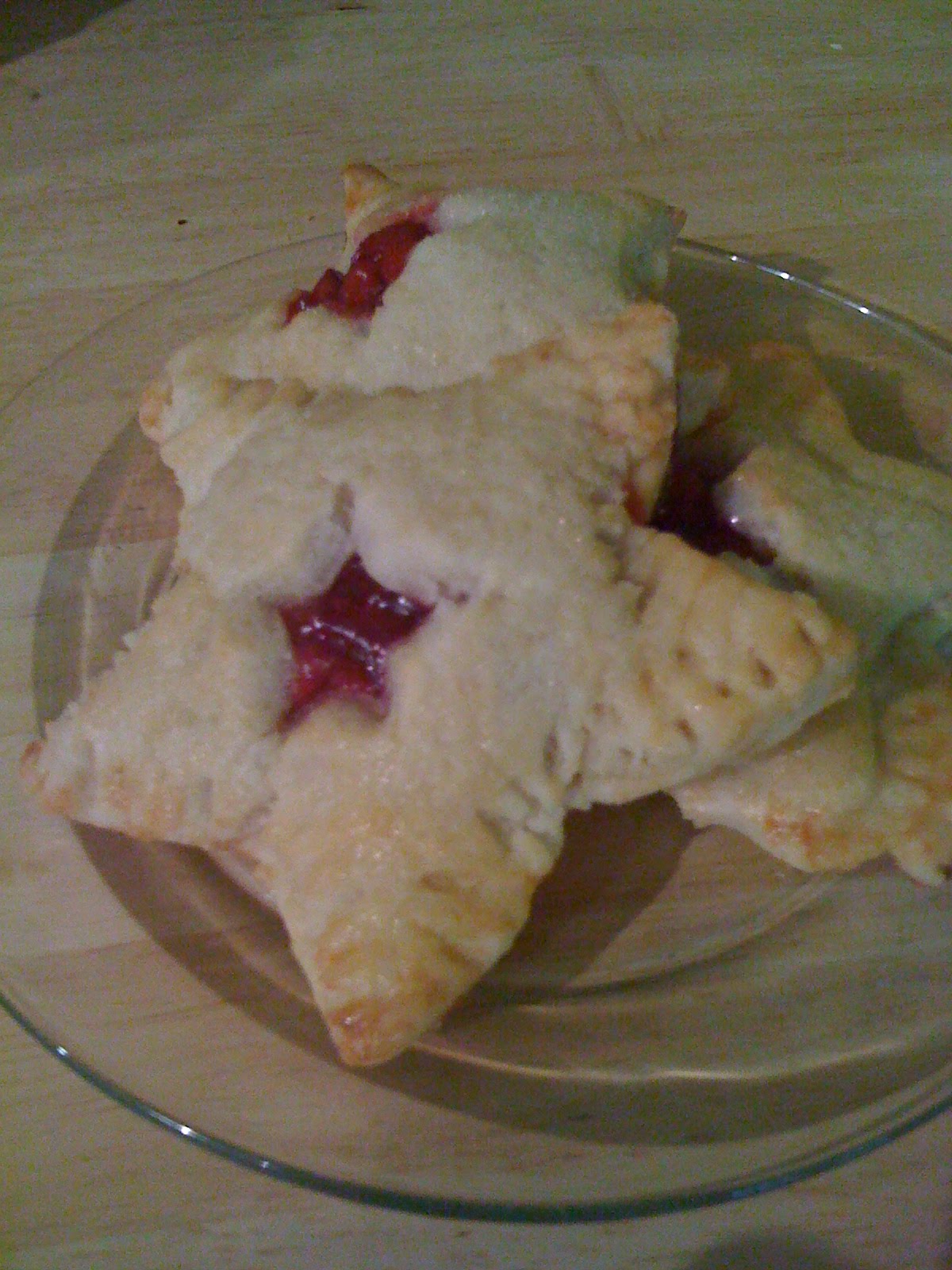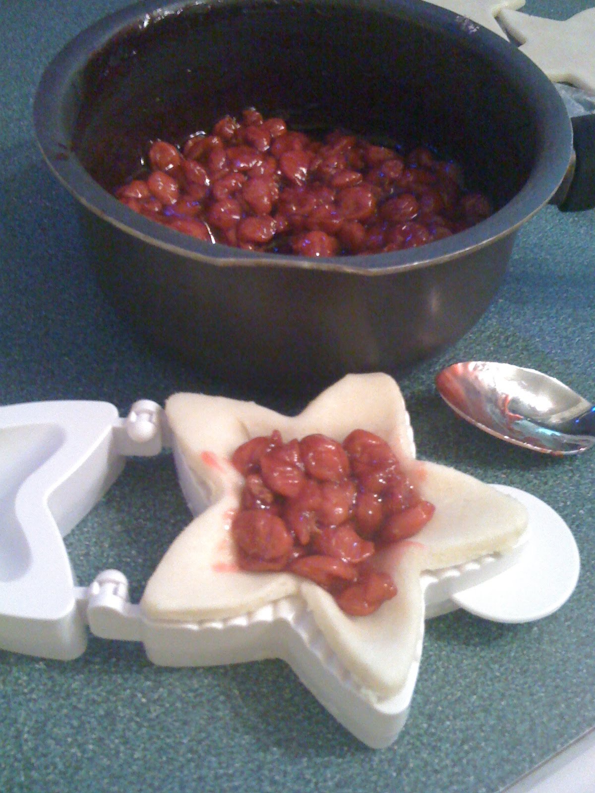 Using the star-shaped pie mold, I cut one half of the dough as solid stars and the second half of the dough with star-shaped vent holes. Follow the instructions for the pie mold (which are easy–put crust in mold, spoon in filling,brush edges with egg wash, top with second piece of crust with vent hole, press together) and place on baking sheet. Sprinkle with granulated sugar.