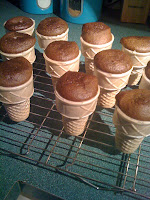 Place ice cream cones in muffin pan. I made rings of aluminum foil around the base of each cone to steady it, however if you have steady hands you might not need to do this. Fill the cones 2/3 full with batter. Bake for 25 to 30 minutes, until a toothpick inserted into cake comes out clean.