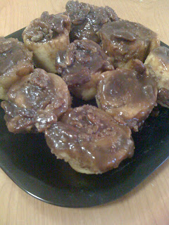 I could not get the dough to rise. These were still better than the pecan pinwheel pastry things at the grocery store, but I would not make this particular recipe again. I would instead revert to my favorite cinnamon roll recipe from Gluten Free Girl and modify it with the caramel stickiness from the above recipe. (I am sure the recipe I tried works very well with regular, gluten-filled, flour. This is not the recipe’s fault!)