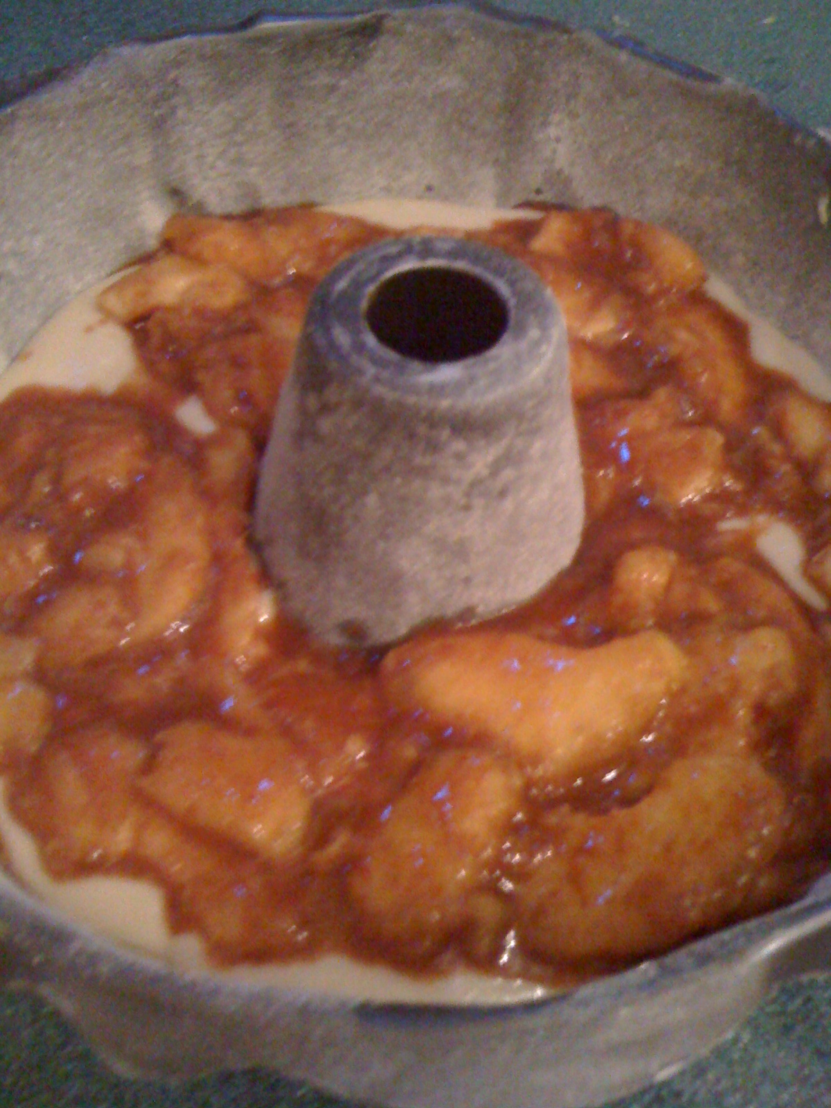 4. Pour 1/3 of the cake batter into the bundt pan. Top the batter with 1/2 of the peaches. Add another 1/3 of the cake batter. Top with the remaining peaches. The final layer is all of the remaining cake batter.