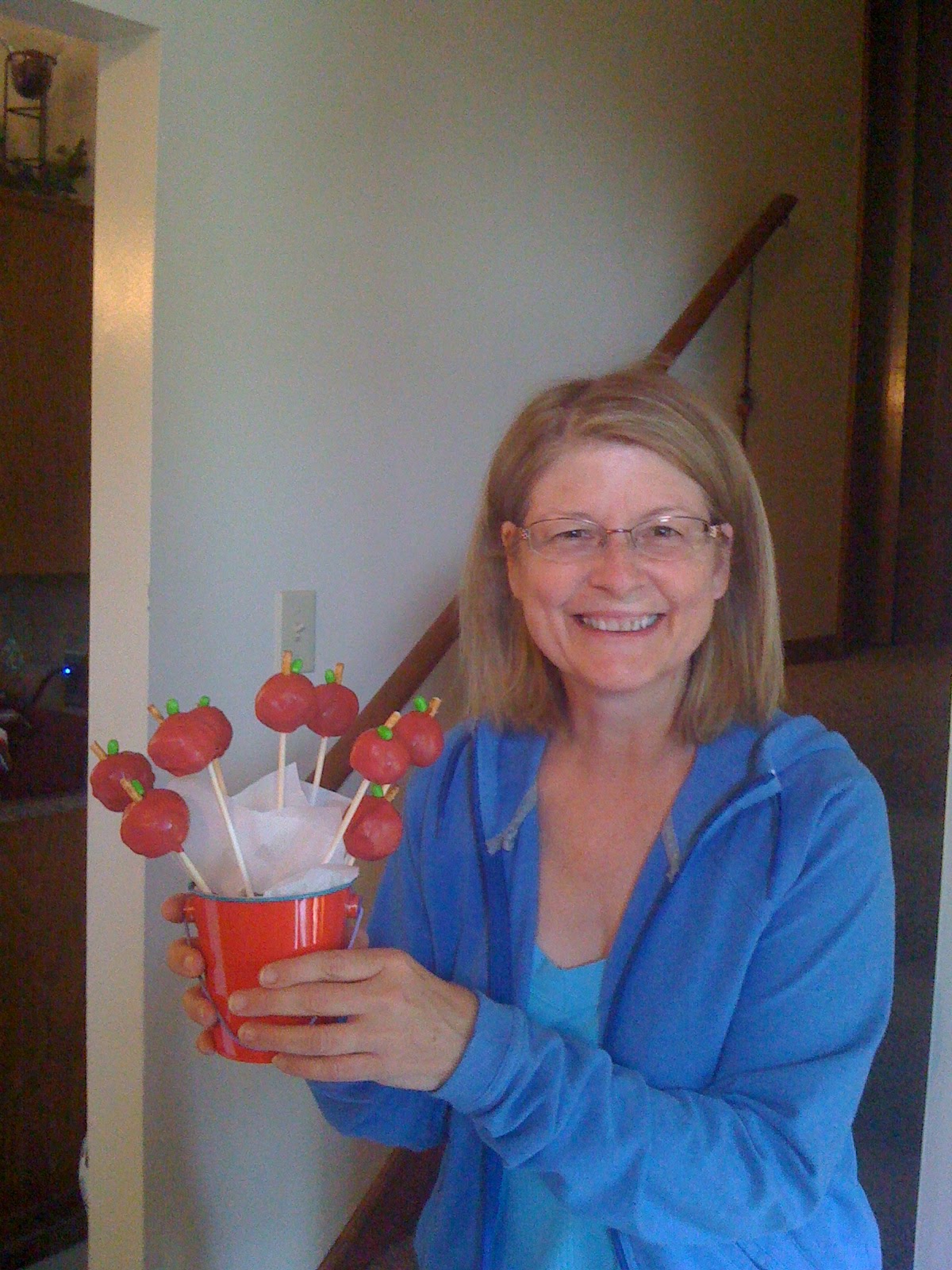 In trying to make this project work, we tried many variations. This is one of my favorites, Deanne’s caramel apple cake pop. So cute!