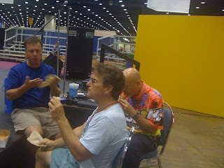 Mark, Rob and Bill shared the sandwich. Rob is Babaloo, a funky children’s musician that adults like, too, (his CD is in my car right now) and Bill is the creator of a super cool kid’s game show. Ever watch that Minute to Win It show? Bill is like a high energy version of that, keeping everyone within shouting distance entertained. His show is a hoot. We had a lot of fun with these guys and they were great sports about eating the Apple Fritterloin concoction.