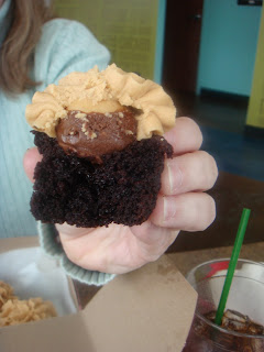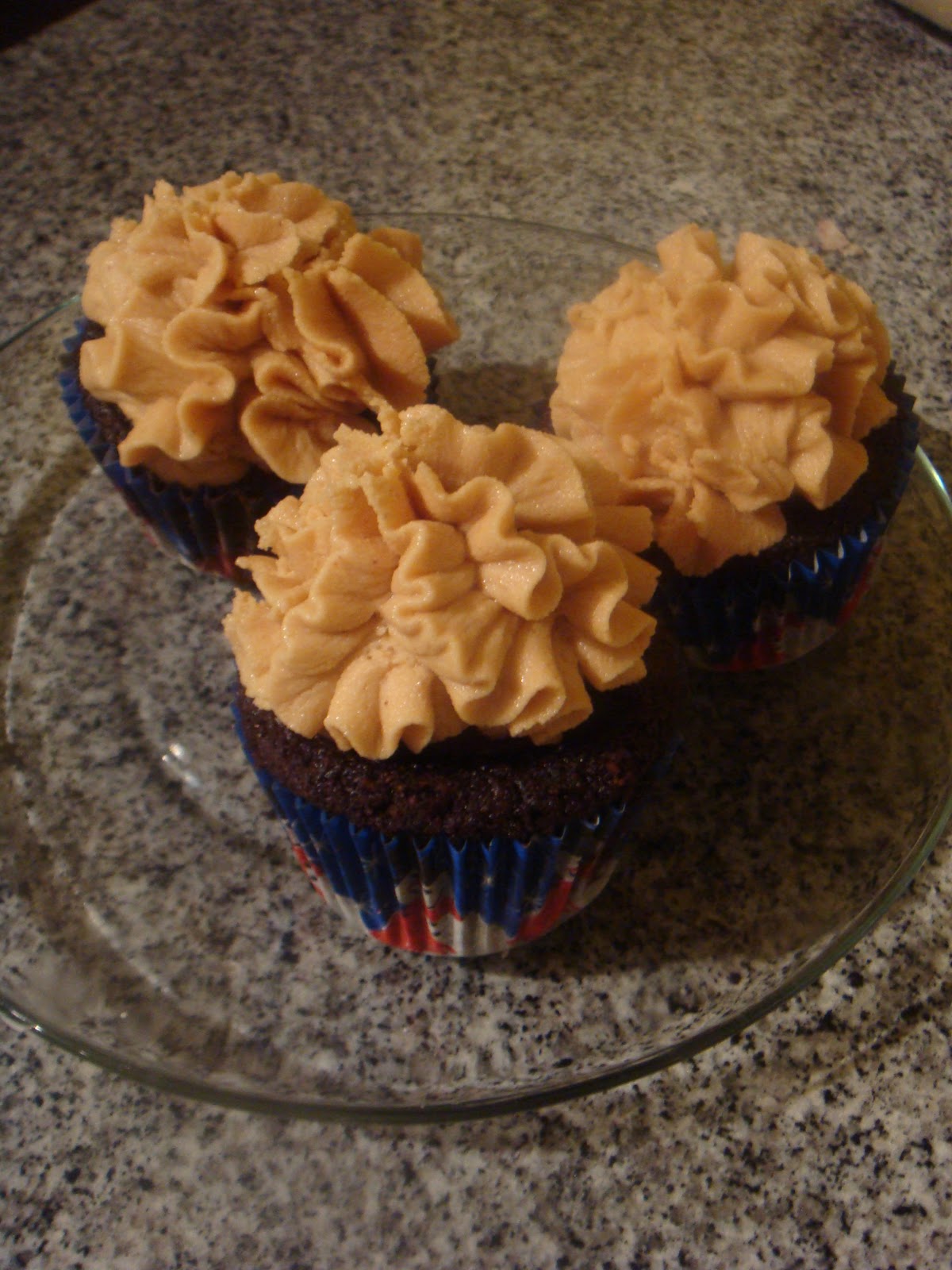I frosted these with a super rich peanut butter buttercream frosting. This is a delicious frosting and holds up well unrefrigerated should you be traveling with cupcakes.