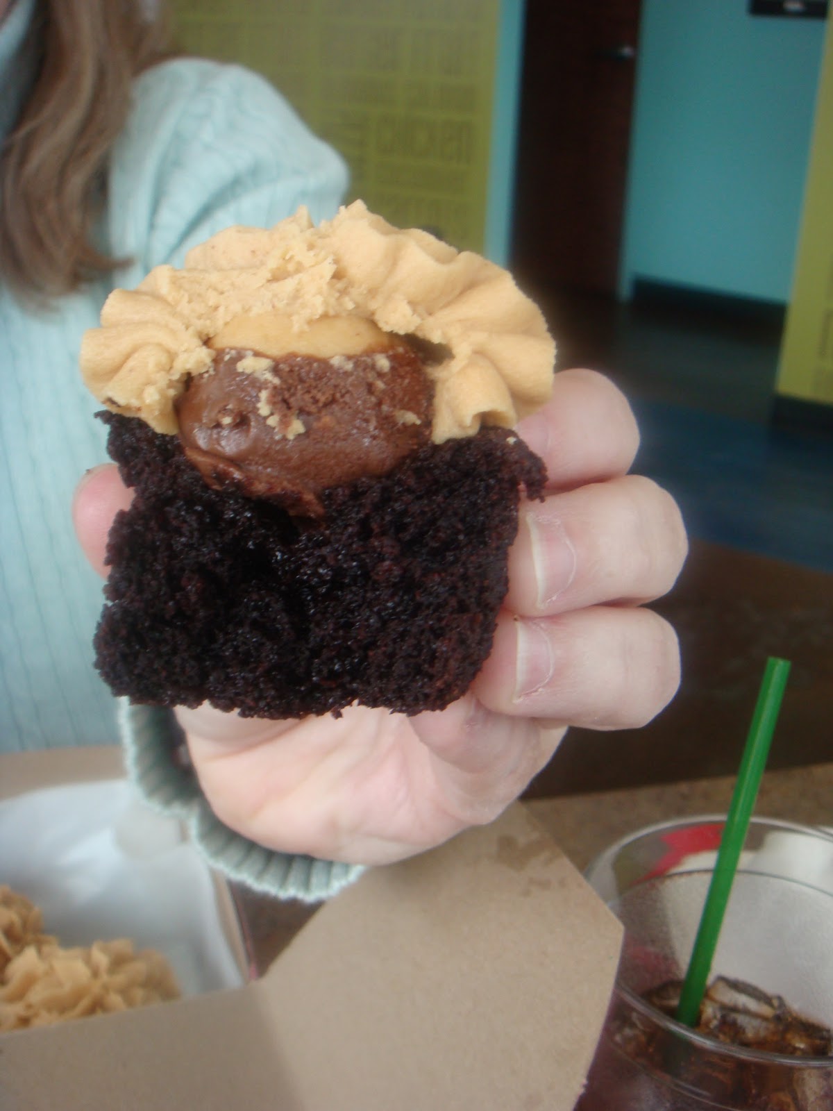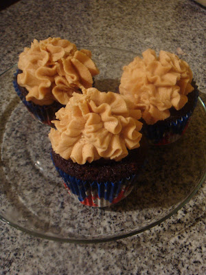 So I made it again. This time I topped the cupcake with a Buckeye. I did not bake the Buckeye in the cupcake, rather I placed it on top after the cupcakes had been baked and cooled. These cupcakes tend to sink in the middle after baking, which makes them perfect for tucking a little surprise on top of before frosting. And while it may seem a little tedious to make cupcakes, a candy and frosting, you can make the candy ahead of time. Buckeyes freeze pretty well, so tuck a couple dozen in the freezer the next time you make them!