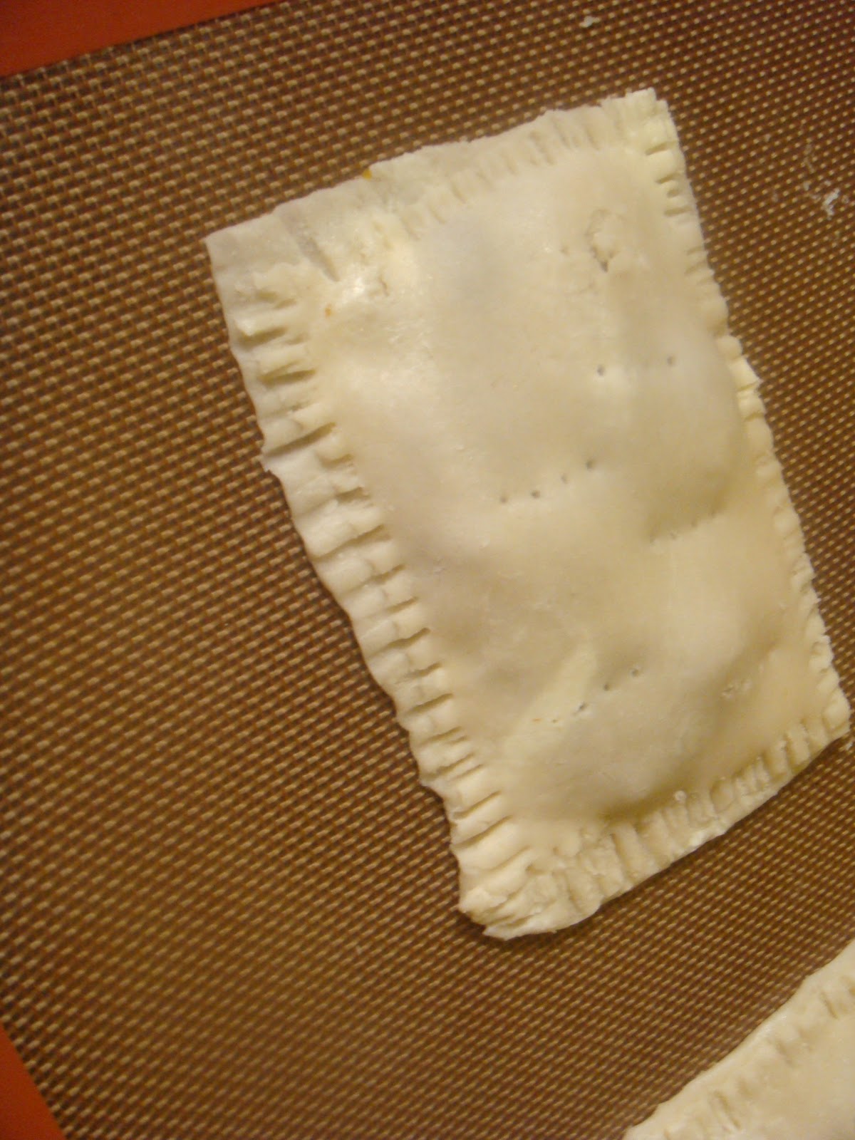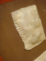 While the filling cools, roll out dough and cut for pop tarts. Instead of rolling out on a floured surface, roll out dough between the sheets of plastic wrap. Roll out slightly thinner than for pie crust. Each ball of dough should roll out into a rectangle the size of a large baking sheet. You will cut this into 8 rectangles the size of a pop tart from the grocery store, I guessed that to be about 4″ x 6″.