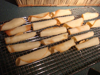 5. Bake cookies 4 to 5 minutes, only until slightly brown on the edges. These brown very quickly. Once out of the oven, gently lift off with a cookie spatula, flipping them over. Immediately roll into a cylindrical shape. They will be HOT so work fast to save your fingers. Place on a cooling rack, top edge down so it does not unroll. If the cookies become brittle when rolling, they can be returned to the oven for just a few seconds to loosen them up.