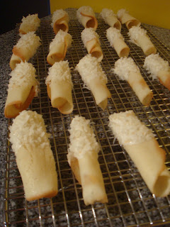7. Dip one end of the cookies into the white chocolate, then sprinkle or roll in coconut. Place on cooling rack to set for 15-20 minutes.