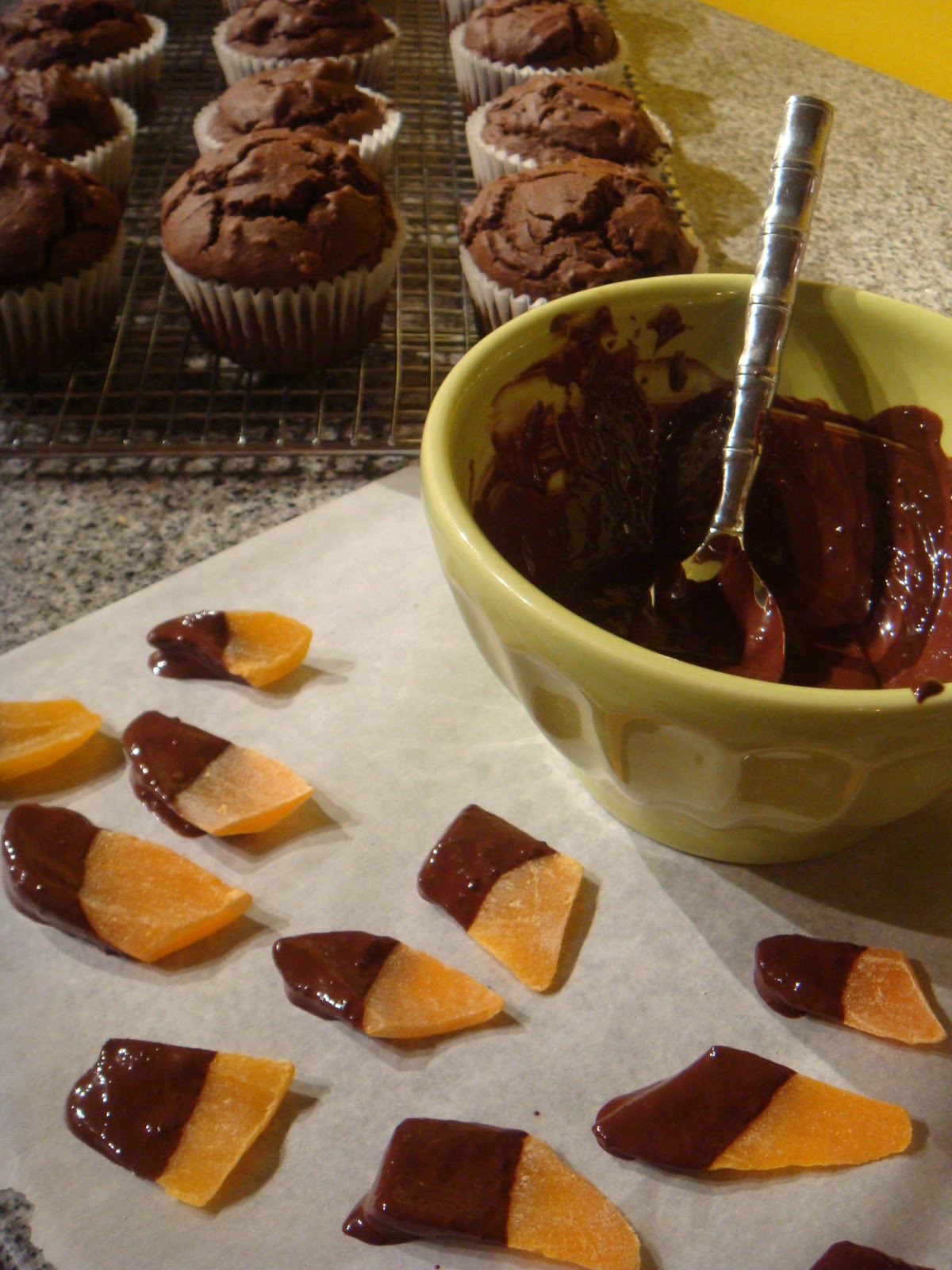 On a piece of wax or parchment paper, count out 16 pieces of dried mango.  Dip each piece in melted Mocha Chocolate and place on paper to cool.  When the chocolate begins to set up, but is not completely hardened, insert the mango pieces into the tops of muffins.  Doing this while the chocolate is still slightly soft allows it to harden and attach to the muffin.