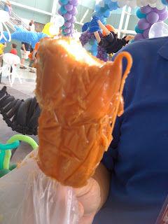 This Food on a Stick didn’t qualify as vegetarian (I don’t eat marshmallows because of the gelatin used in them) so Mark agreed to taste this one. I have to say it looked very tasty, the caramel was gooey and the marshmallows were soft and squooshy. For a moment I thought about putting my ethical eating standards on hold just so I could taste this!