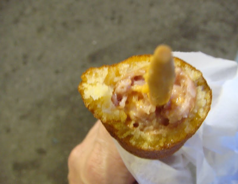 #49: Ham & Cheese on a Stick – This was, by far, the worst “food on a stick” experience all night. Billed as a Ham & Cheese on a Stick . . .again, I am picturing a Monte Cristo style of sandwich with layers of warm black forest ham and melted cheese on Texas Toast, dipped in batter and deep fried. No. Not. Even. Close. What I got was a corn dog filled with chopped ham salad and melted American cheese. It looked and tasted like baby food. It was mushy, and disgusting. I took one bite for the cause, and pitched the rest. Rating: F