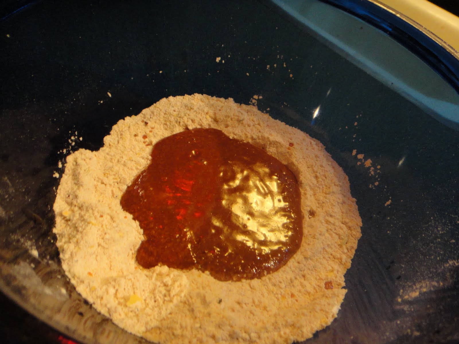 Make a well in the dry ingredients, pour in the wet. Mix well. After a few turns of the spoon, you may find it easier to mix with your hands. Knead it a bit, making sure everything is well incorporated. Let rest for a few minutes.