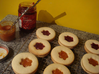 Move cookies to cooling rack. Once cool, warm the jam in the microwave for 30 seconds to thin it a little bit. If it is too thin, let it cool a little before using. Spread a scant teaspoon of jam on top near the center of a full circle. Place a cutout cookie on top. You may add a bit more into the cutout in the center to fill the hole.