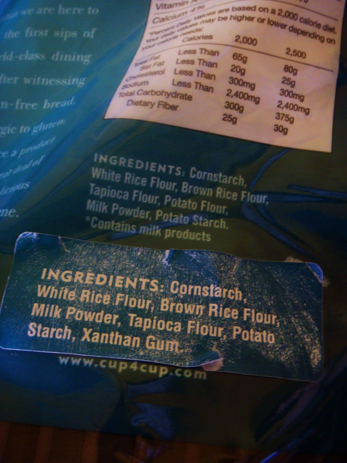 Here’s what you need to know about Cup4Cup: as I already mentioned, it is $20 for 3 pounds. It contains dairy, problematic for the growing number of gluten-free folks who also avoid dairy. It contains xanthan gum, an ingredient falling out of favor amongst many avid gluten-free bakers. The primary ingredient is cornstarch. It also contains many of the same ingredients as my flour blend, many basic flours found at your local grocery store. Here’s the ingredient list (please note a sticker of revised ingredients was applied over the original list on the packaging, both are shown here 🙂