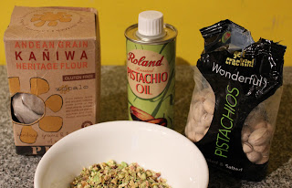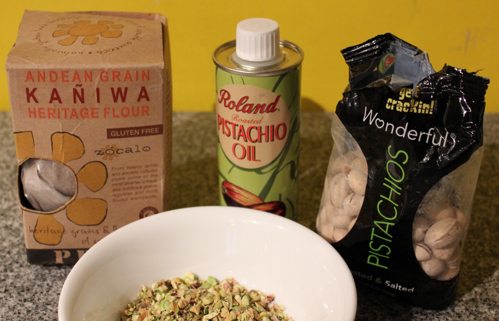 About this week’s challenge ingredients: I located Roasted Pistachio Oil on my recent visit to Jungle Jim’s. It was $12 for a small metal container. It has a green color similar to grapeseed oil and a deep, roasted flavor that would be a great in many Autumn dishes. From the first taste of this oil, there is no mistaking that it comes from pistachios, the nut flavor comes through very clearly. I plan to use it on roasted Brussels sprouts this weekend. The second ingredient used this week is kaniwa flour. Kaniwa is an ancient seed, much like quinoa and teff, that is used like a grain. It has a high protein content. I paid $13 for a 1 pound box of this flour. When used in this cake, it caused the finished product to have a darker color, making it easily mistaken for a chocolate cake. I thought you might want to know that before you started experimenting with incorporating it into your recipes.