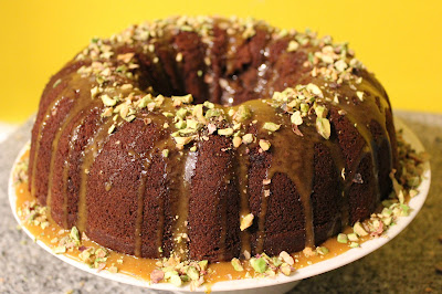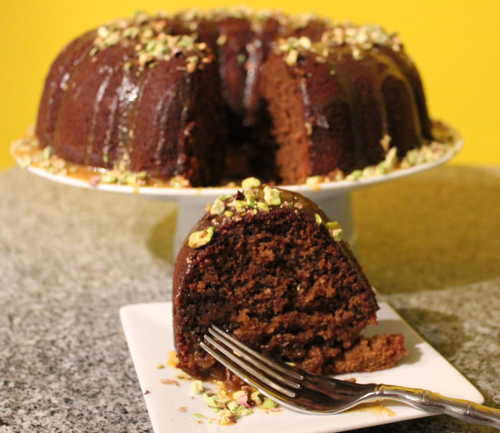 Drizzle glaze over the top of the cooled cake and sprinkle with chopped pistachios. Enjoy!