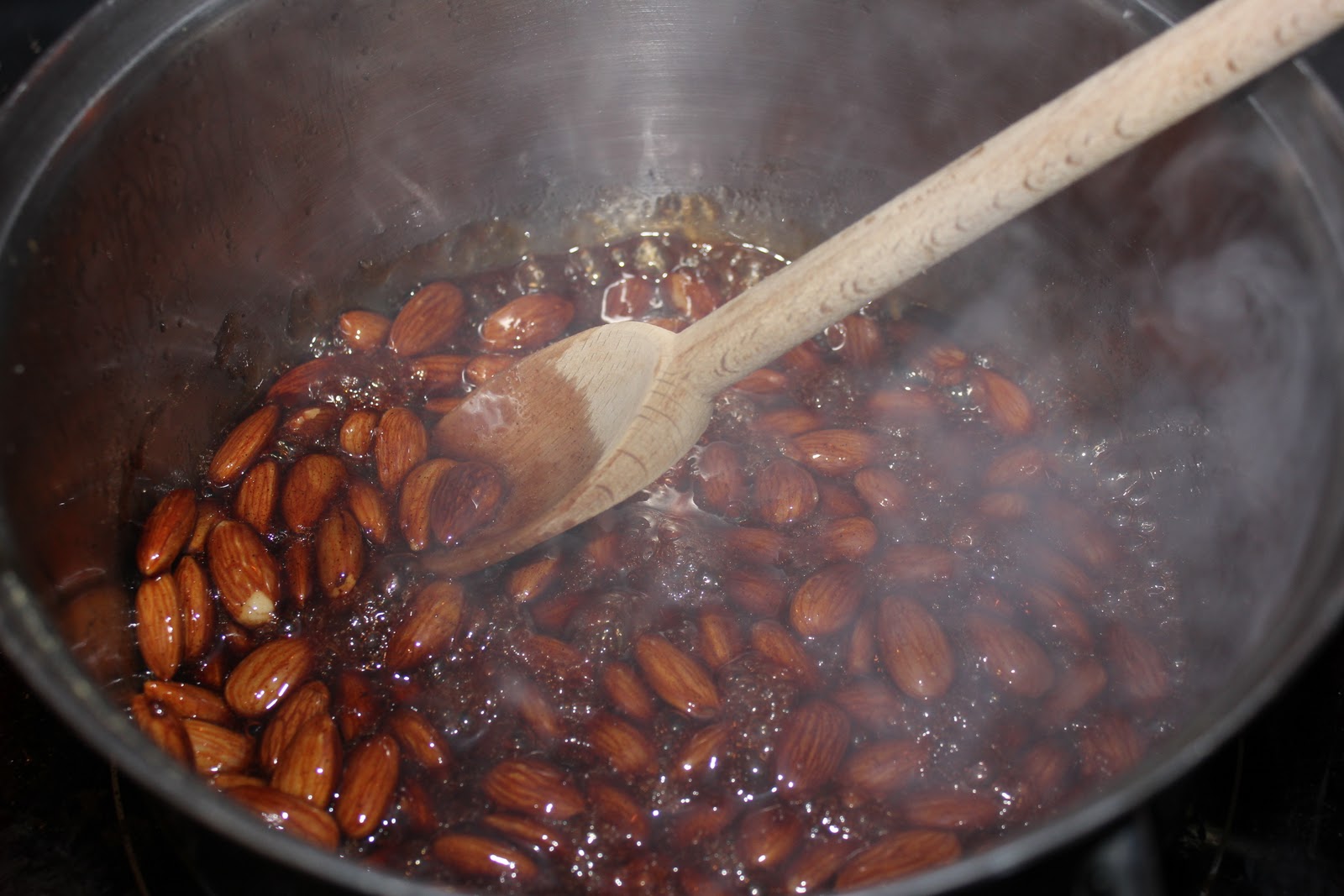 Add 1/2 cup sugar, water, vanilla bean paste and spices to a heavy-bottomed pan. Cook over medium until boiling. Stir a lot! Add almonds and stir more. Stir, stir, stir…Once about 1/2 of the sugar has adhered to the nuts and a slightly grey-brown tinge has appeared, add the remaining 1/4 cup sugar. Turn heat down to medium-low. Keep stirring! Stir more. Really, keep stirring! Once all of the sugar is dissolved and about 1/2 of the nuts have a shiny coating, remove from the heat and pour out into a Silpat-lined baking sheet. You could also use parchment paper.