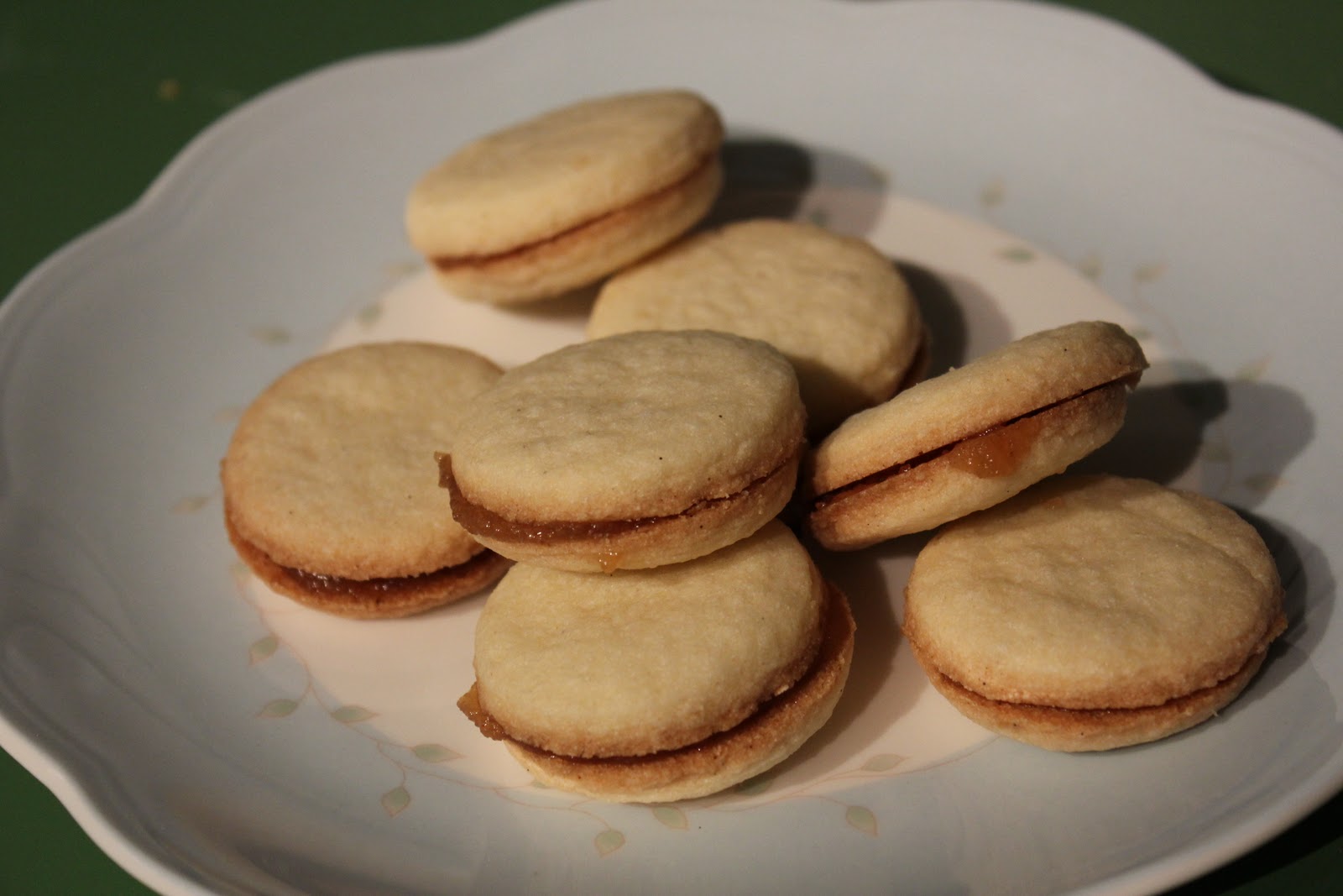 Move cookies to cooling rack. Once cool, spread a scant teaspoon of jam, butter or other filling on the flat side of one cookie. Top with another cookie. That’s it!