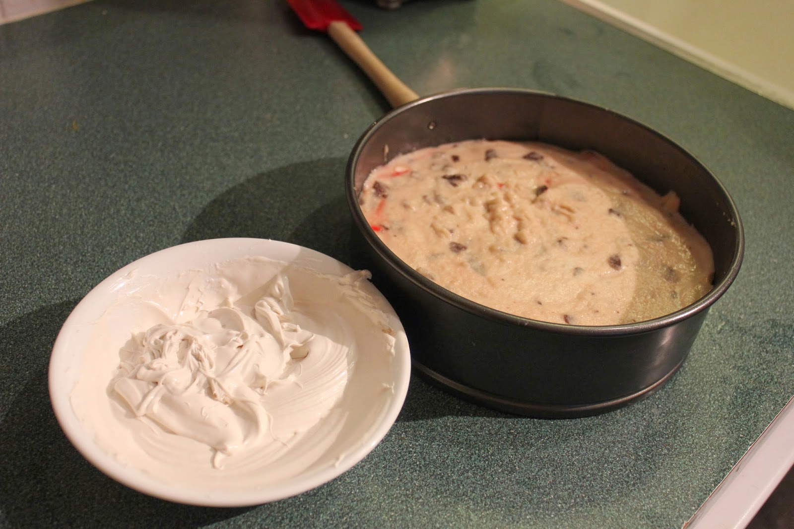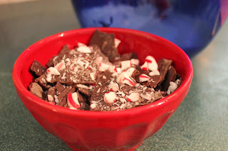 First you’ll need to make some peppermint bark. I melted 8 oz. of dairy-free chocolate chips (I used Enjoy Life) and spread it out on a sheet of parchment paper. Before it set, I sprinkled the top with 4 or 5 crushed candy canes. Once it has set, crumble it up into small pieces.