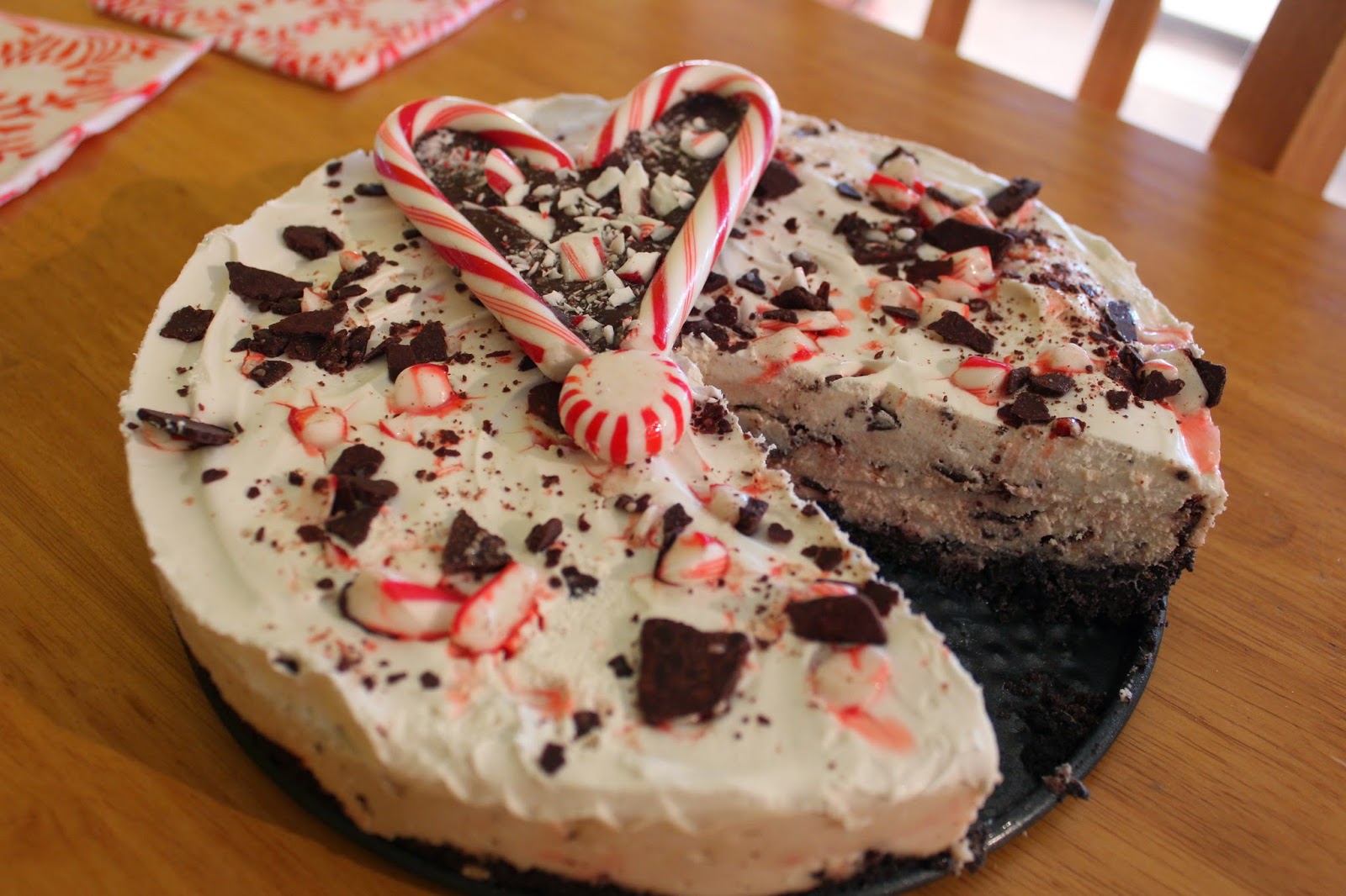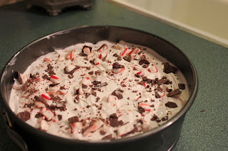 When you remove it from the freezer for serving, sprinkle the top with broken candy cane pieces, leftover peppermint bark or chocolate shavings. It is important to add the toppings now, not when you first assemble the cheesecake. The color from the candy canes will run atop the mousse filling if you add them before freezing.