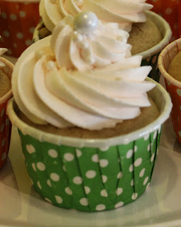 On top of the frosting, I used two sizes of sugar pearls that I bought at Sweet!  They remind me of champagne bubbles.  I also baked the cupcakes in pretty nut cups from Sweet!  I like baking cupcakes in these, no need for a muffin tin.