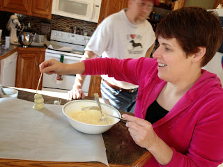 While at Renee’s house, she was making regular (i.e. non-snowmen) Oreo truffles so we turned a few into melted snowmen. That’s A above skillyfully painting faces on little melted snowmen truffles. Cute, huh? Same recipe: 1 package oreos, 8 oz. cream cheese and melted white chocolate for dipping. I used candy writers to draw the faces.