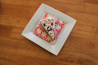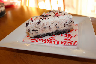 Here are a few photos of my cheesecake, my version of the peppermint bark pop and the cute peppermint plate I made: