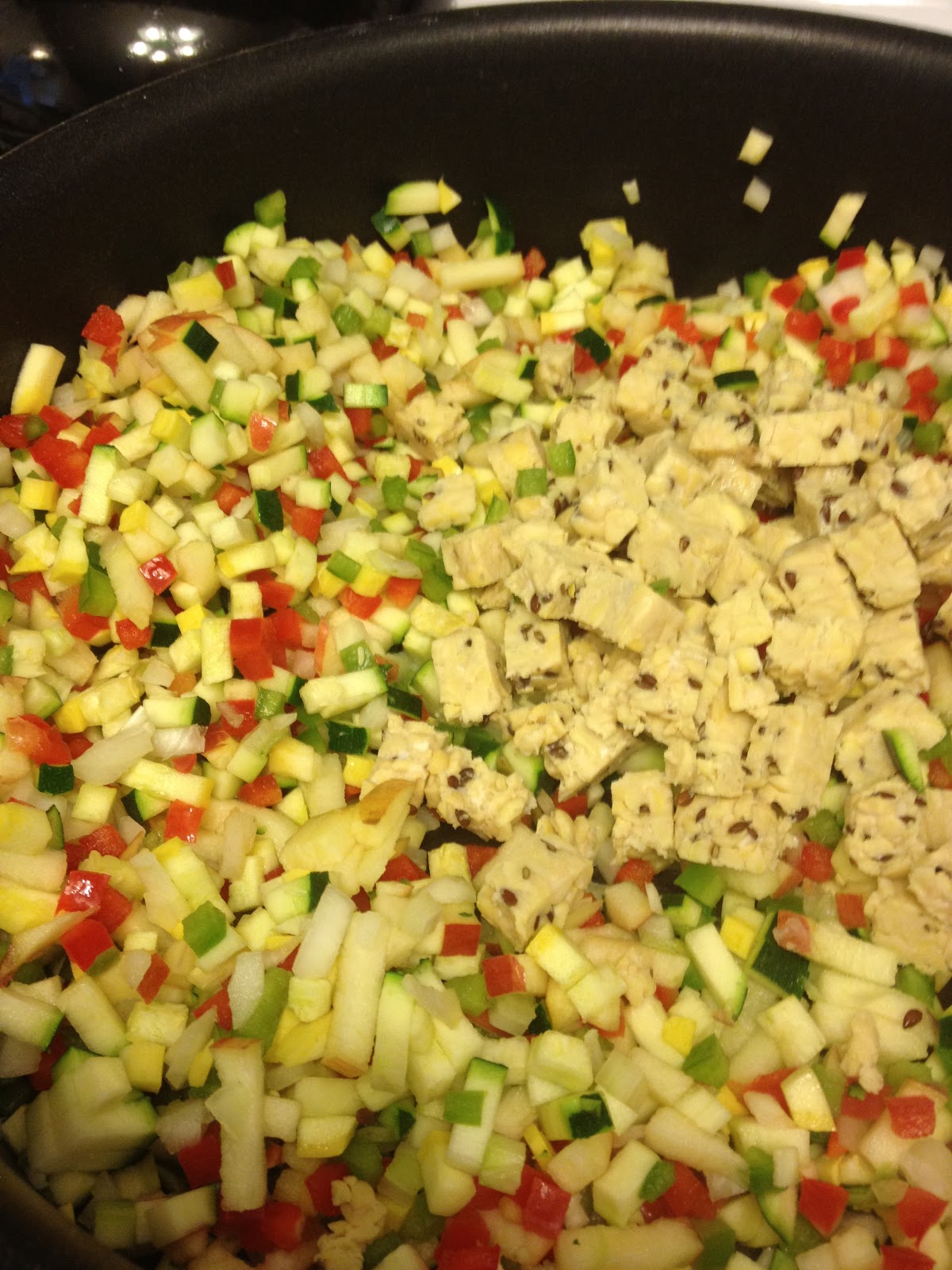 Once onions have softened, stir in the roasted spaghetti squash, tempeh, fire roasted tomatoes, garlic, paprika and basil. Cook just long enough for the last additions to incorporate.