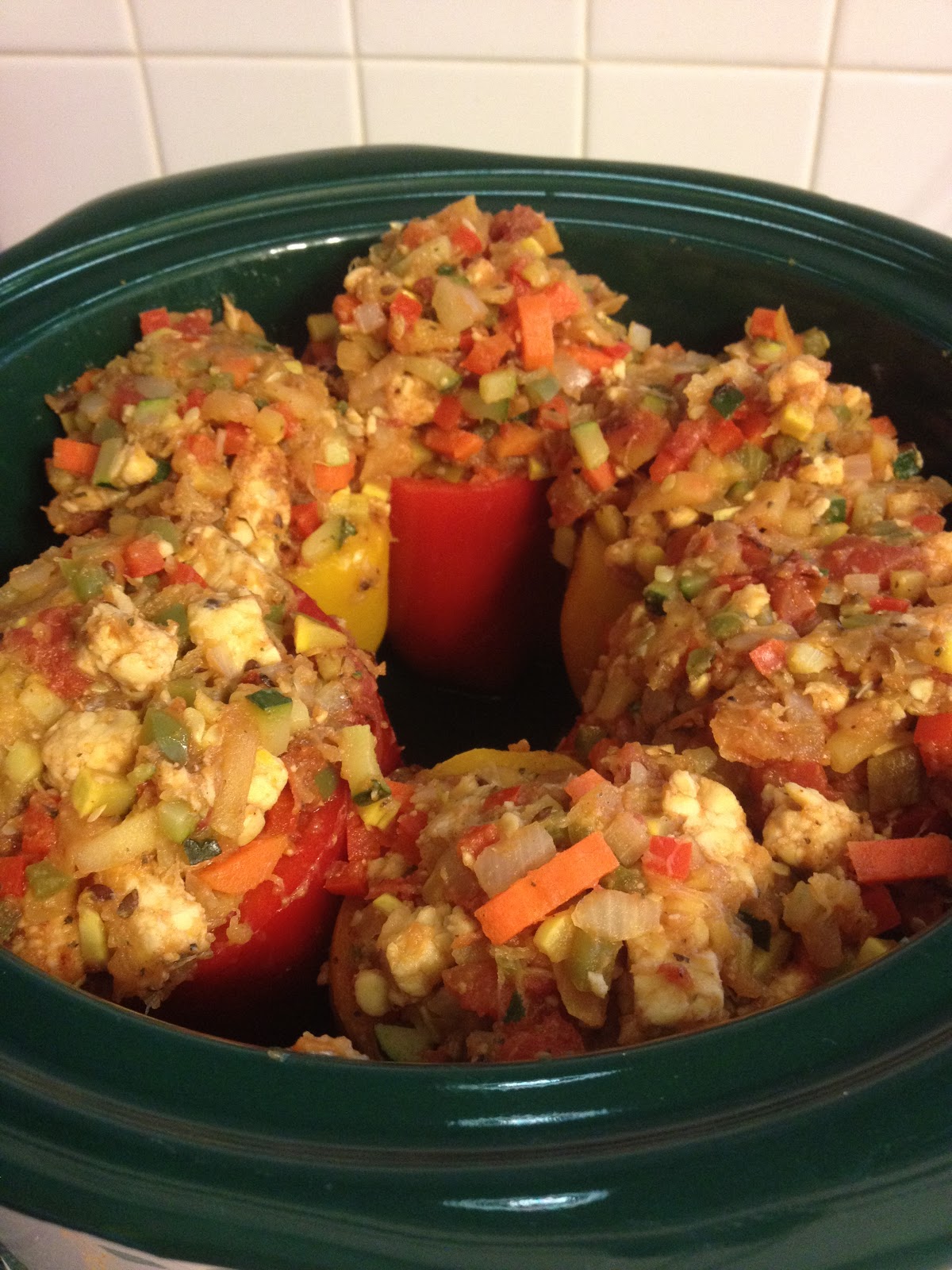 Cut the tops off of the 6 large bell peppers. Clean out the seeds. Have your slow cooker out and ready to go at this point. Scoop the vegetable and tempeh filling into the peppers and gently nest into your slow cooker. You can put the tops of the peppers back on if you like, it doesn’t matter for cooking but it does look nice for serving.