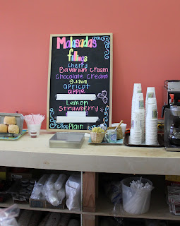 Lots of fillings were offered, with a list of flavors posted on the wall. When they run out of a flavor for the day, they tape over it. We bought a Bavarian cream, a guava, a plain un-filled and a chocolate cream. They all disappeared quickly!