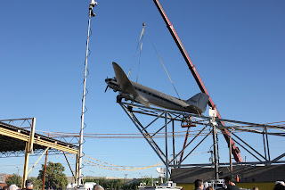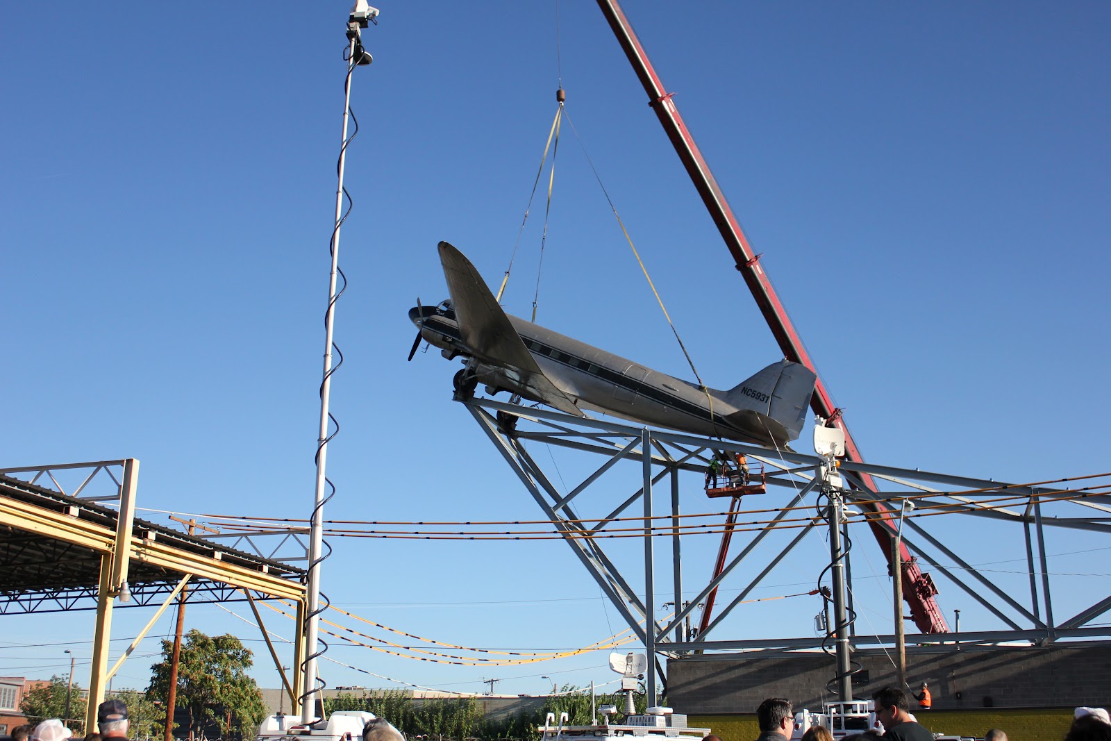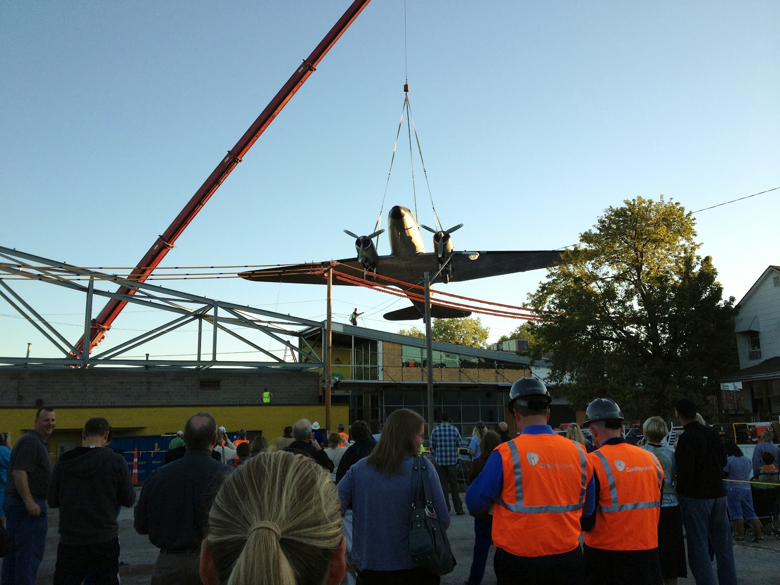 This morning I went to see a DC-3 airplane lifted by a crane, placed atop The Roasterie, my favorite coffee roaster in Kansas City. It was an incredible site.