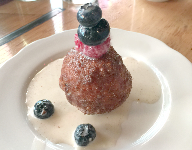 Port Fonda has beautiful ricotta doughnut holes, four to an order, rolled in cinnamon-sugar, aswim in mezcal tres leches and topped with fresh berries.