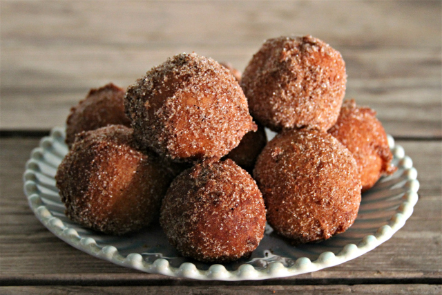 While the next doughnuts are frying, roll the first few in the cinnamon sugar mixture and place on your serving plate.