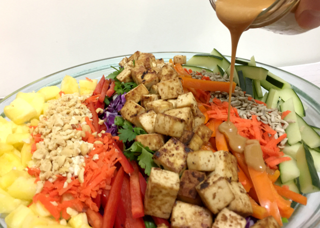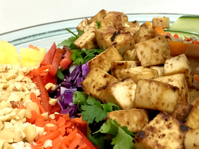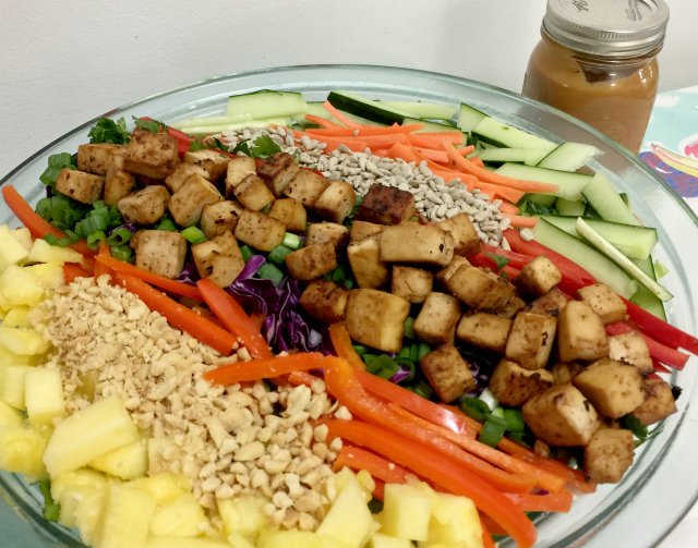 Place cooled tofu atop salad last. Serve with dressing on the side or toss dressing into salad if you prefer.
