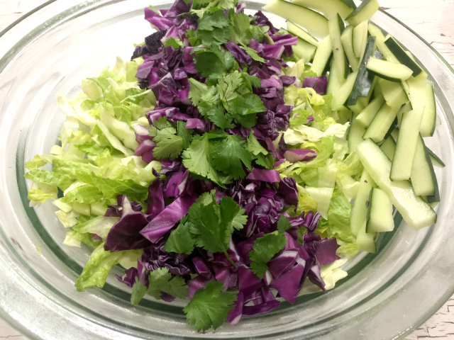 First, I put the romaine and green cabbage in the bowl and toss them together.