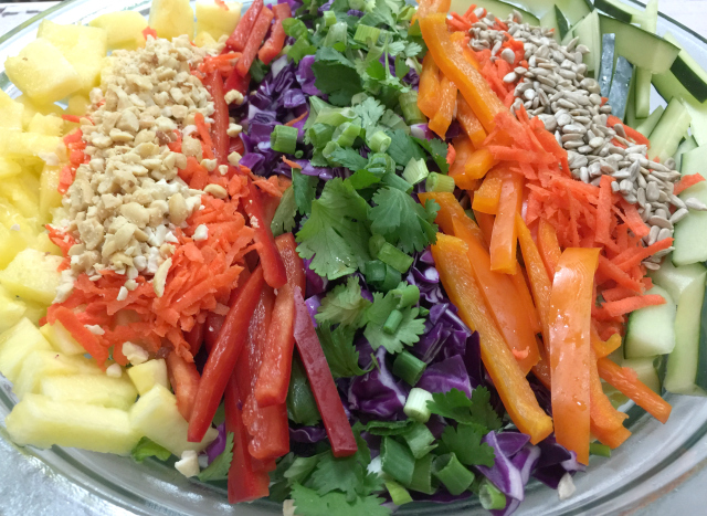 Next, I add the red cabbage in a pretty line down the center and top with cilantro, cucumbers around one edge, maybe pineapple around the other.