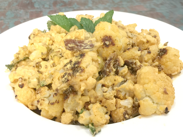 While cauliflower is roasting, shell and roughly chop pistachios. Cut dates into slivers. Add these both to the bowl you used to toss the cauliflower in oil. Add most of the mint leaves to the bowl, reserving a few for garnish.