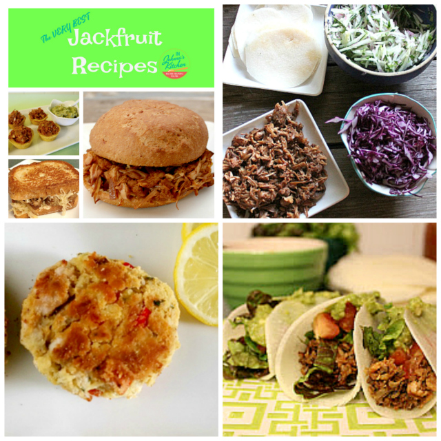 The recipes I’m sharing below all use young green jackfruit. This is important to note. It will come canned in either a salt brine or water. I prefer the water packed version, but when the brine version is all that is available, it works well after a good rinse. You’ll find this at Asian markets, Trader Joe’s, on Amazon and some larger supermarkets. None of the recipes below use ripe sweet jackfruit, which is best used for desserts.